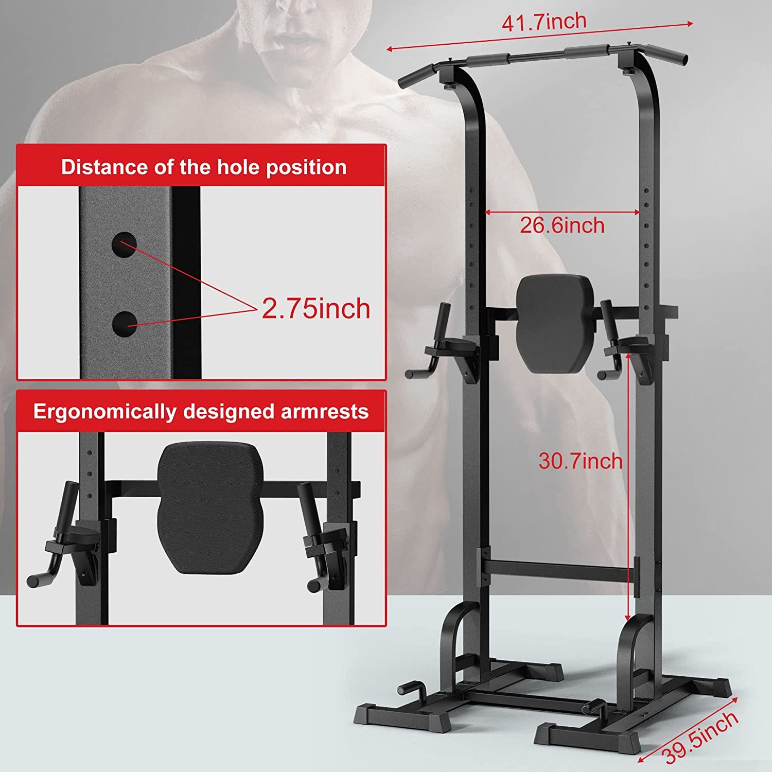 1.Multiple uses power tower can be used for pull-ups, double-bar flexion arms, double-bar flexion knees, push-ups and other kinds of training, all-round exercise all parts of the body.